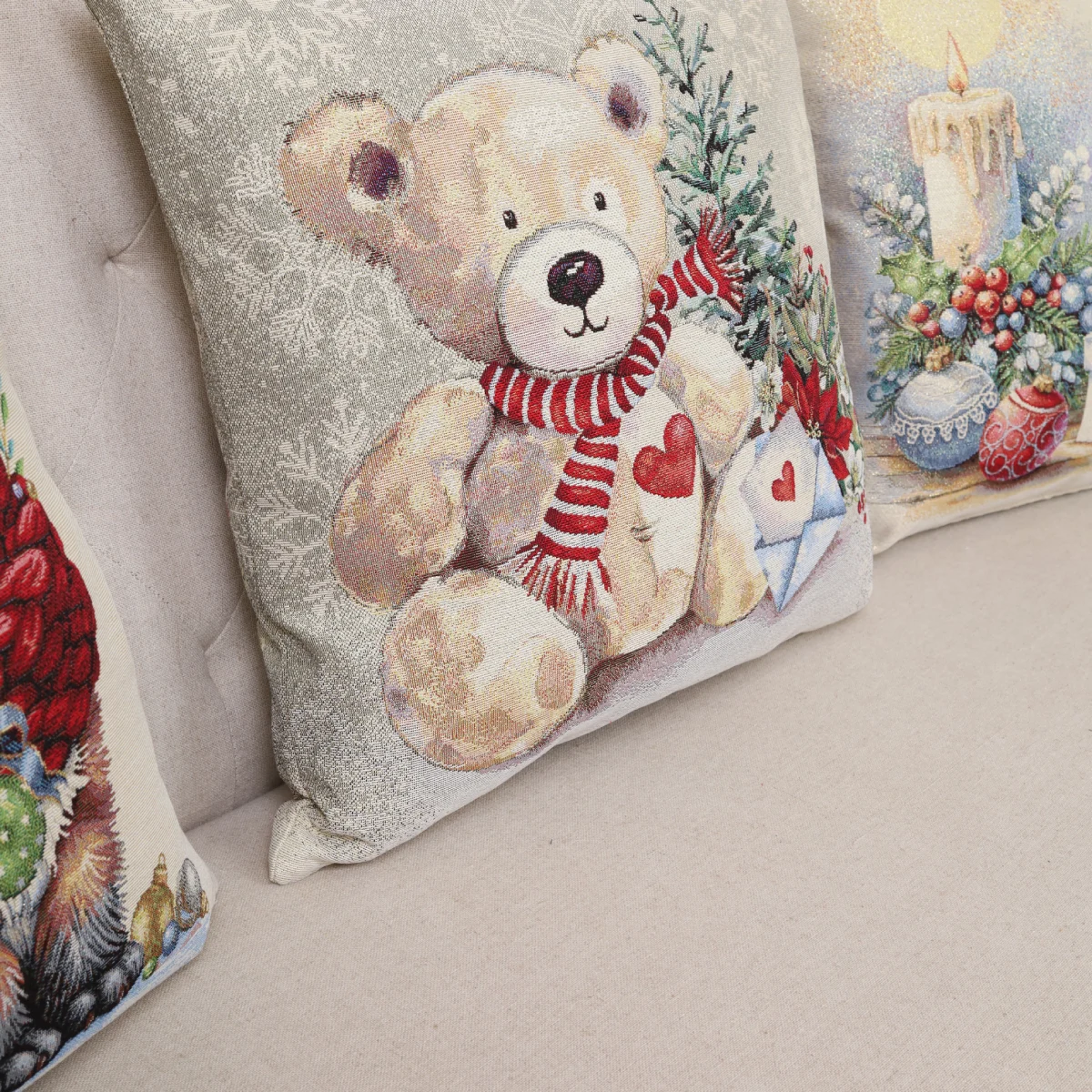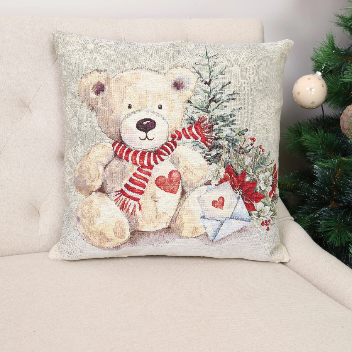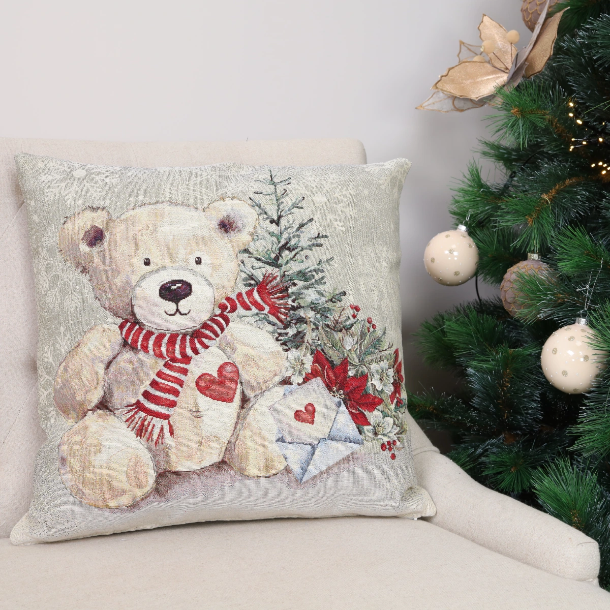 Dwustronna poszewka na poduszkę Miś z prezentami — to doskonały prezent dla każdego miłośnika Świąt.