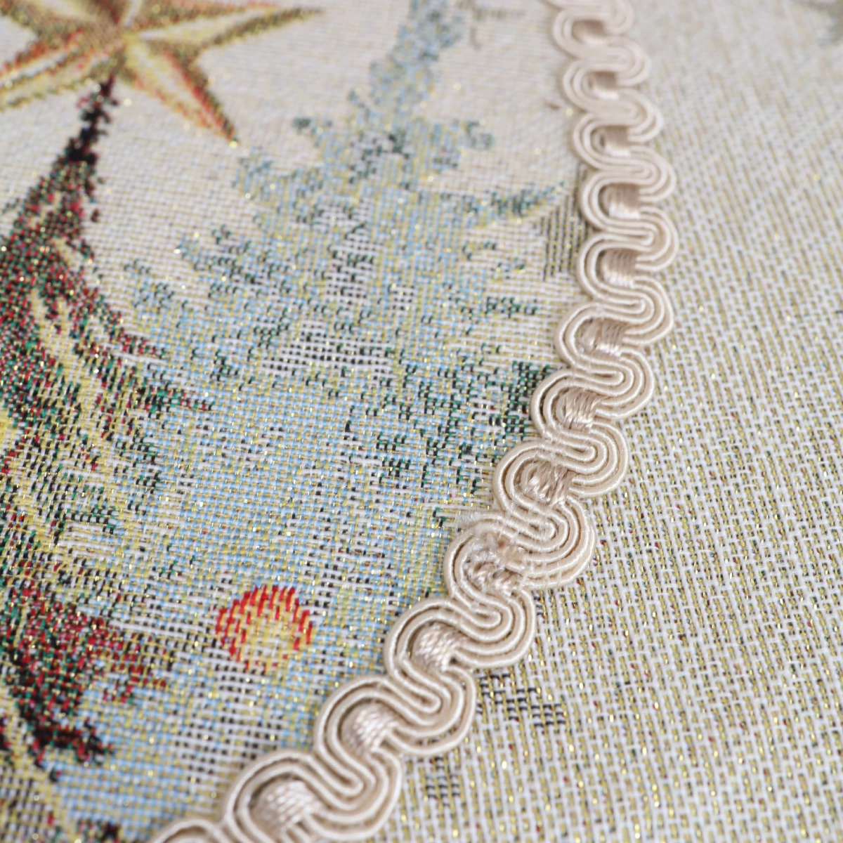 Cechy szczególne: w tkaninie zastosowano subtelnie połyskującą złotą nitkę — lurex.