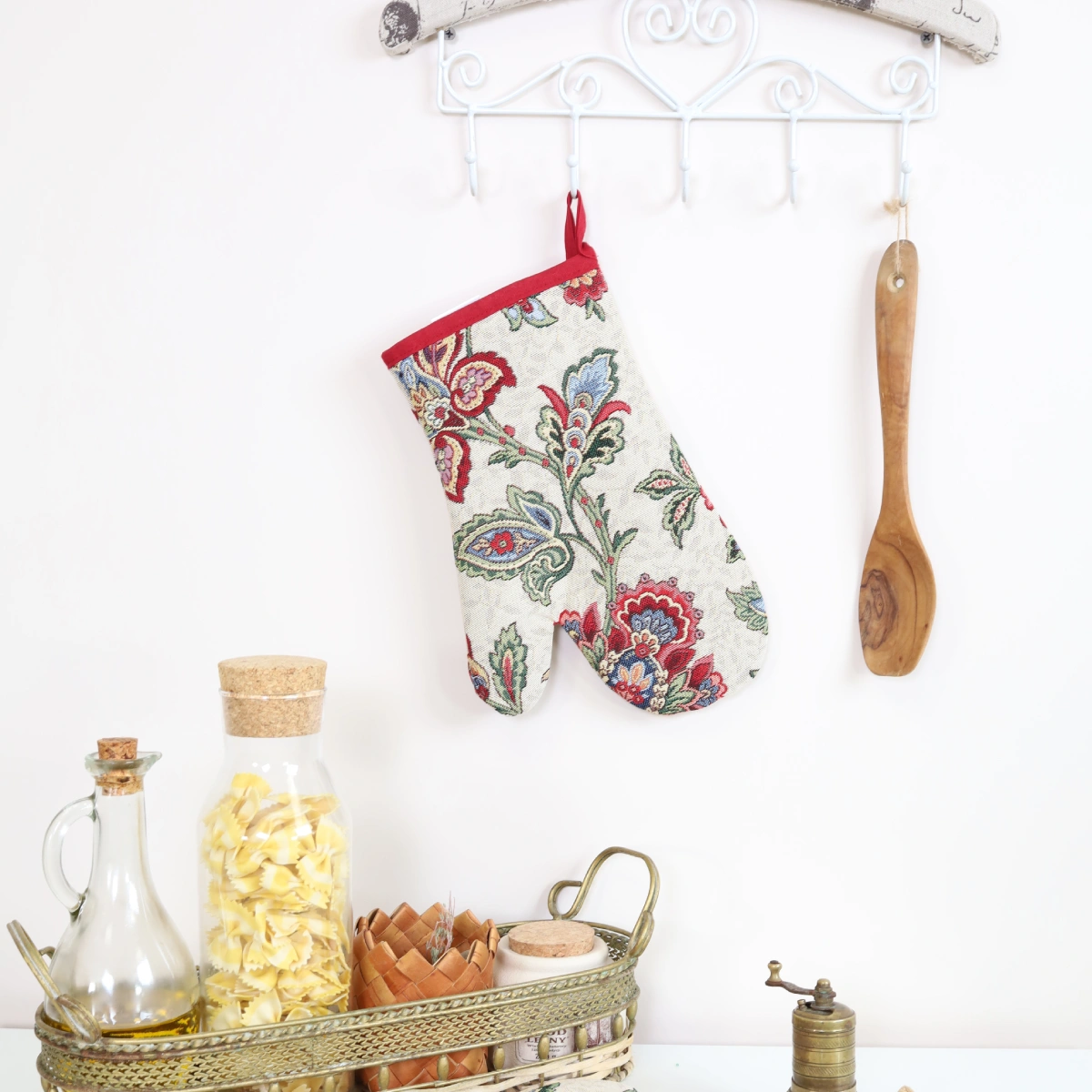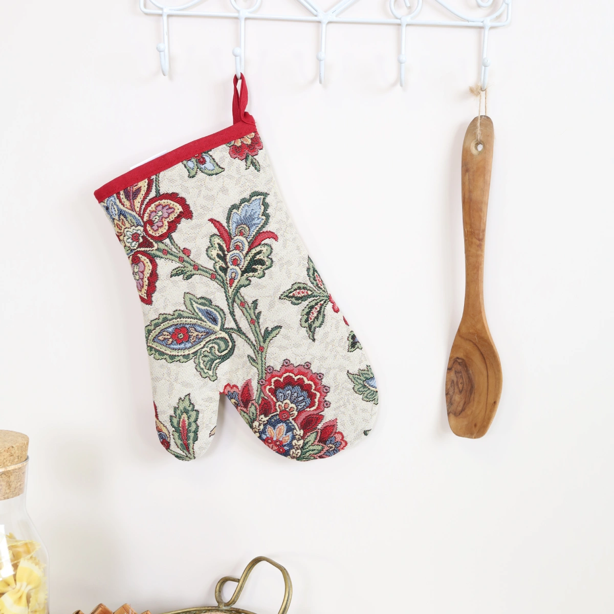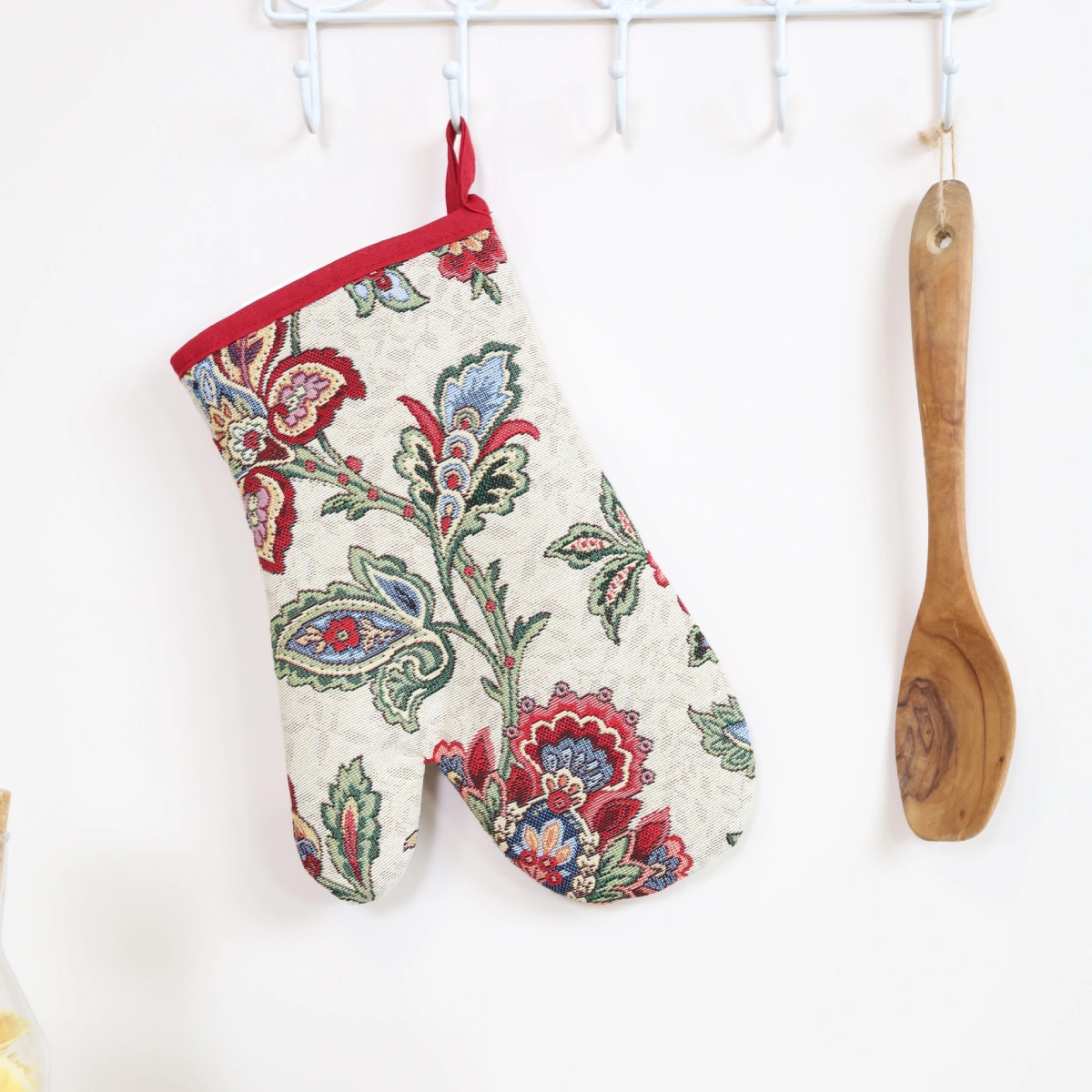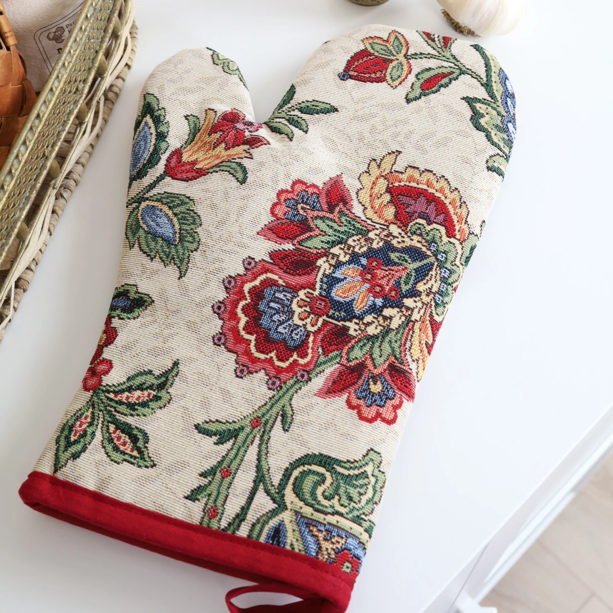 Rękawica kuchenna z tkaniny gobelinowej.