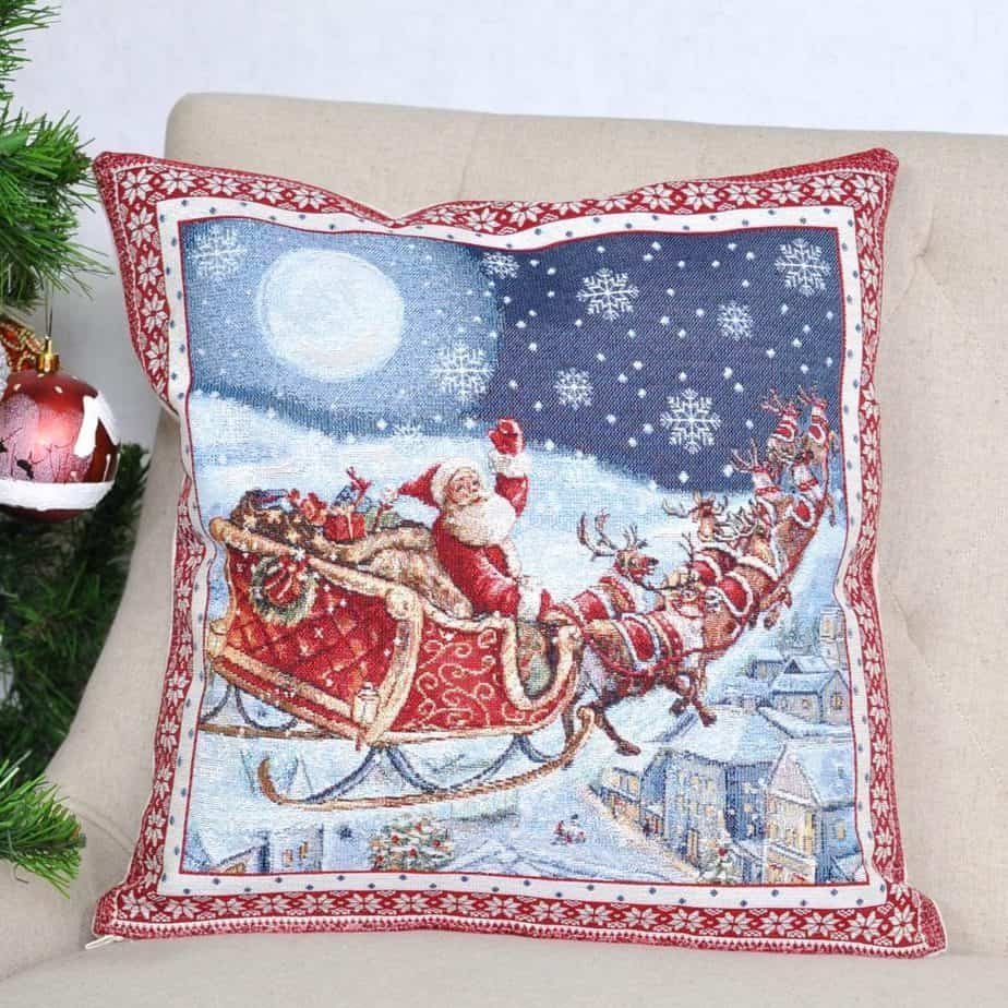 Świąteczna poszewka na poduszkę Święty Mikołaj na saniach — dla przytulności Twojego domu! To doskonały prezent świąteczny zarówno dla bliskich, jak i dla siebie.
