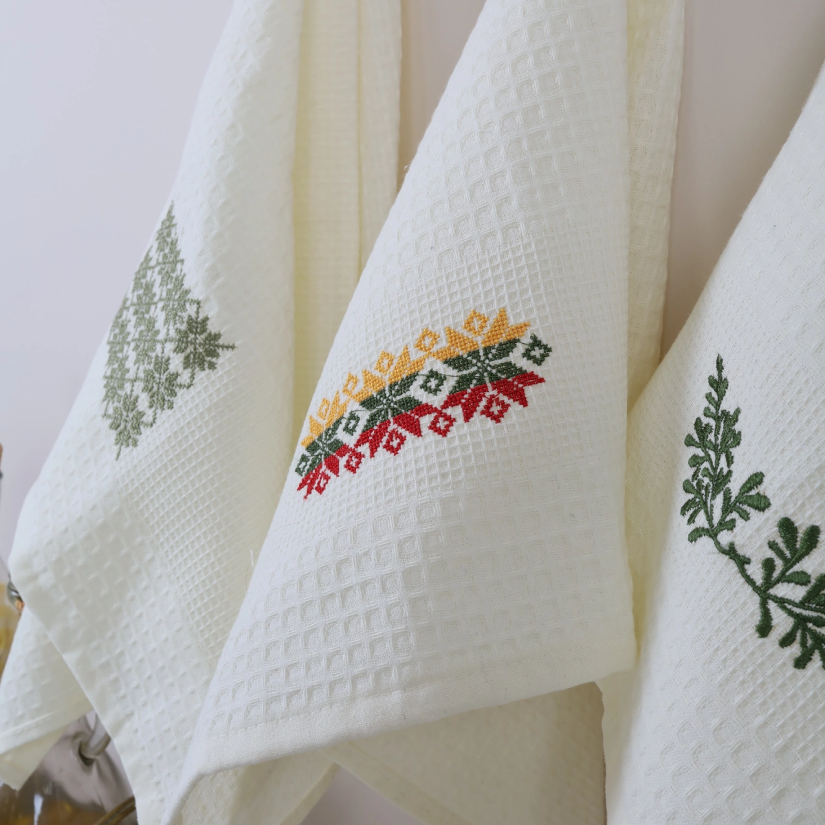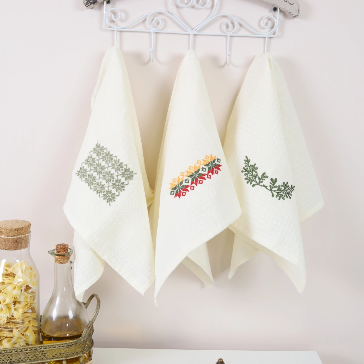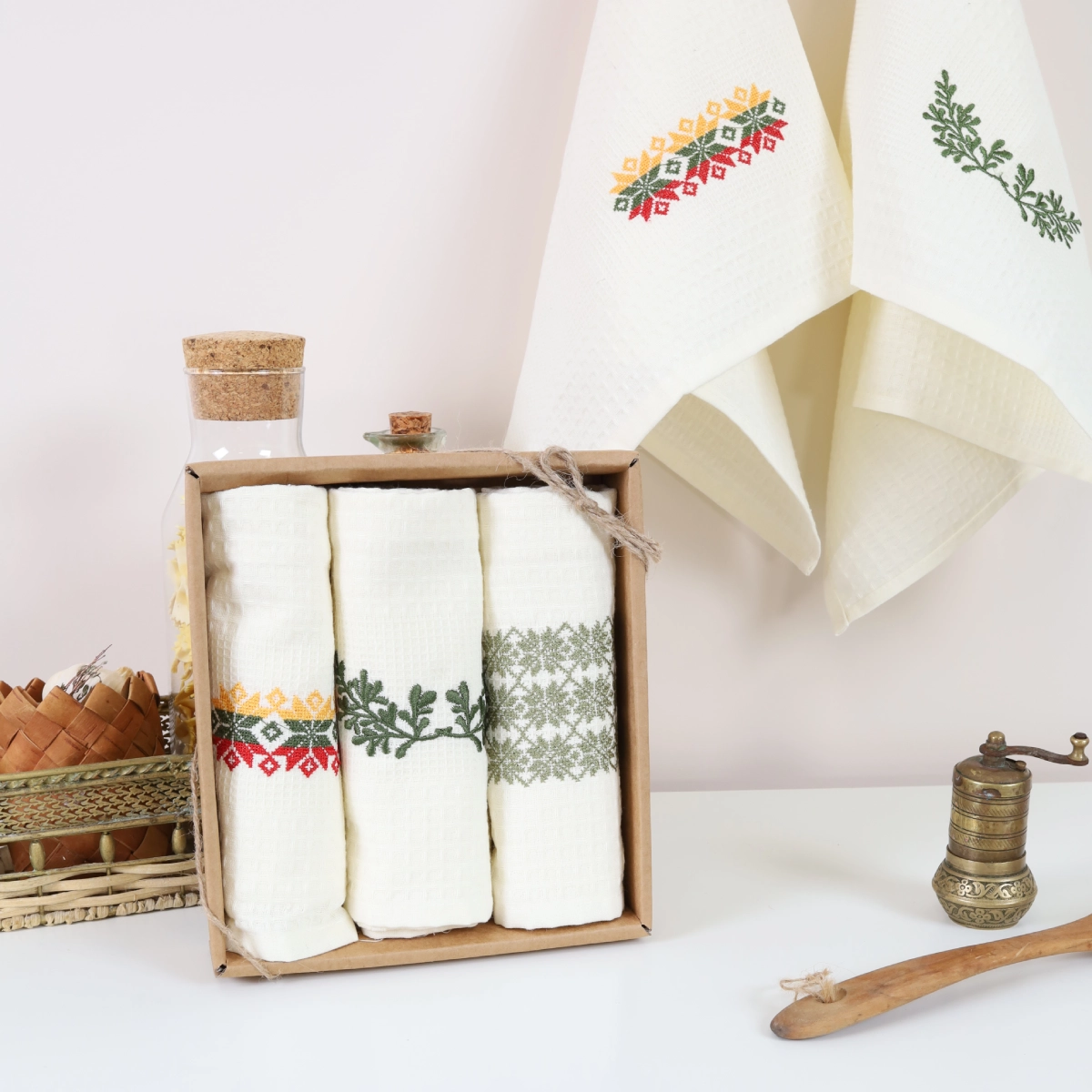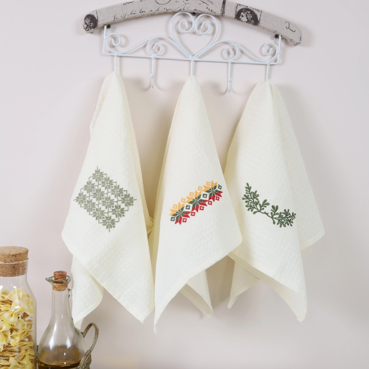Zestaw ręczników kuchennych Ornamenty ludowe składa się z 3 różnych ręczników utrzymanych w tym samym stylu, z ludowymi ornamentami.